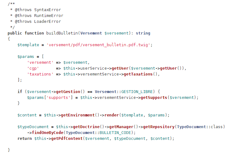Aujourd'hui j'ai aussi fait du pair programming (aussi appelé extrême programming) ça consiste à coder à deux personnes David me posait des questions de logique, et mettait pratique mes réponses, c'était impressionnant mais aussi incompréhensible pour moi qui ne sais pas coder du php, voici un screen(=capture d'écran) d'un extrait de code qui a pour but de générer un fichier pdf, il n'est pas entier bien sûr car ce serait bien trop grand morceau-de-code-en-php